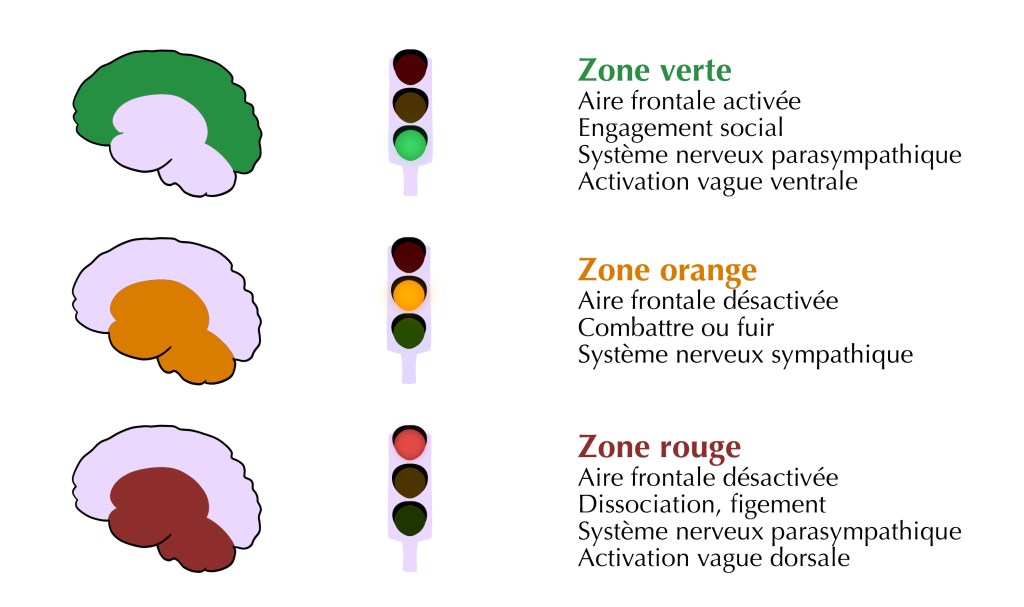 La zone verte correspond au parasympathique ventral. C’est le mode de sécurité et d’engagement social. L’aire frontale du cerveau est activée.